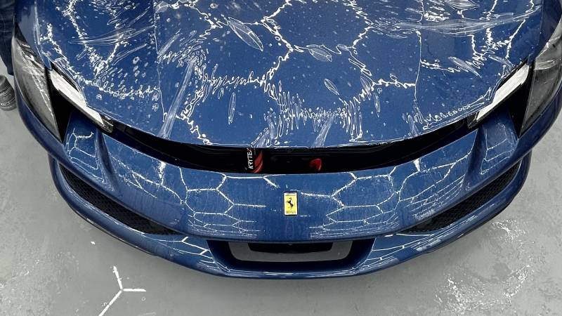 En complément du PPF XPEL, un traitement céramique KRYTEX 9H+/9H+/MEGA8 garantie 3 ans est appliquée afin d'offrir une protection supplémentaire à la peinture de la Ferrari 296 GTB.